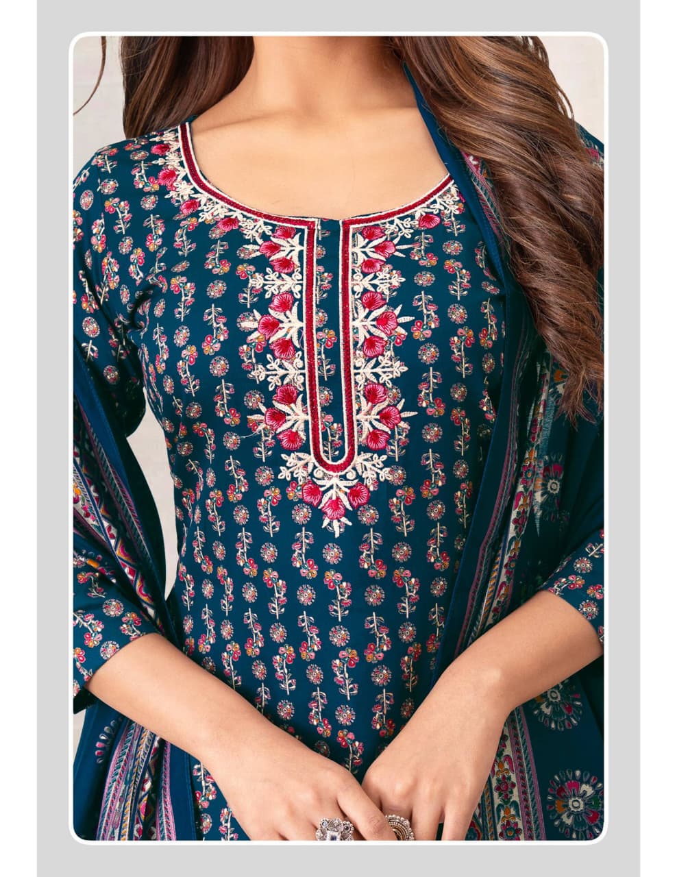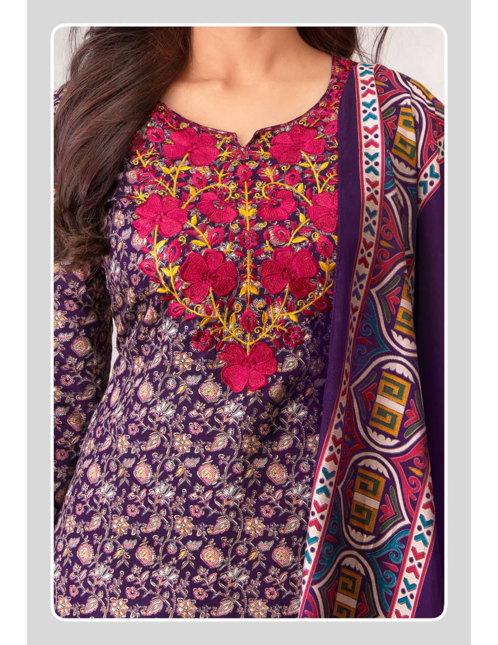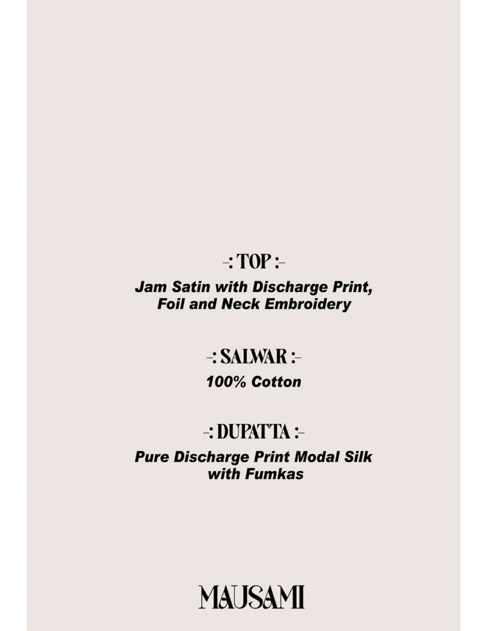 Top : Heavy Jam Satin with Discharge Print, Foil and Neck Embroidery