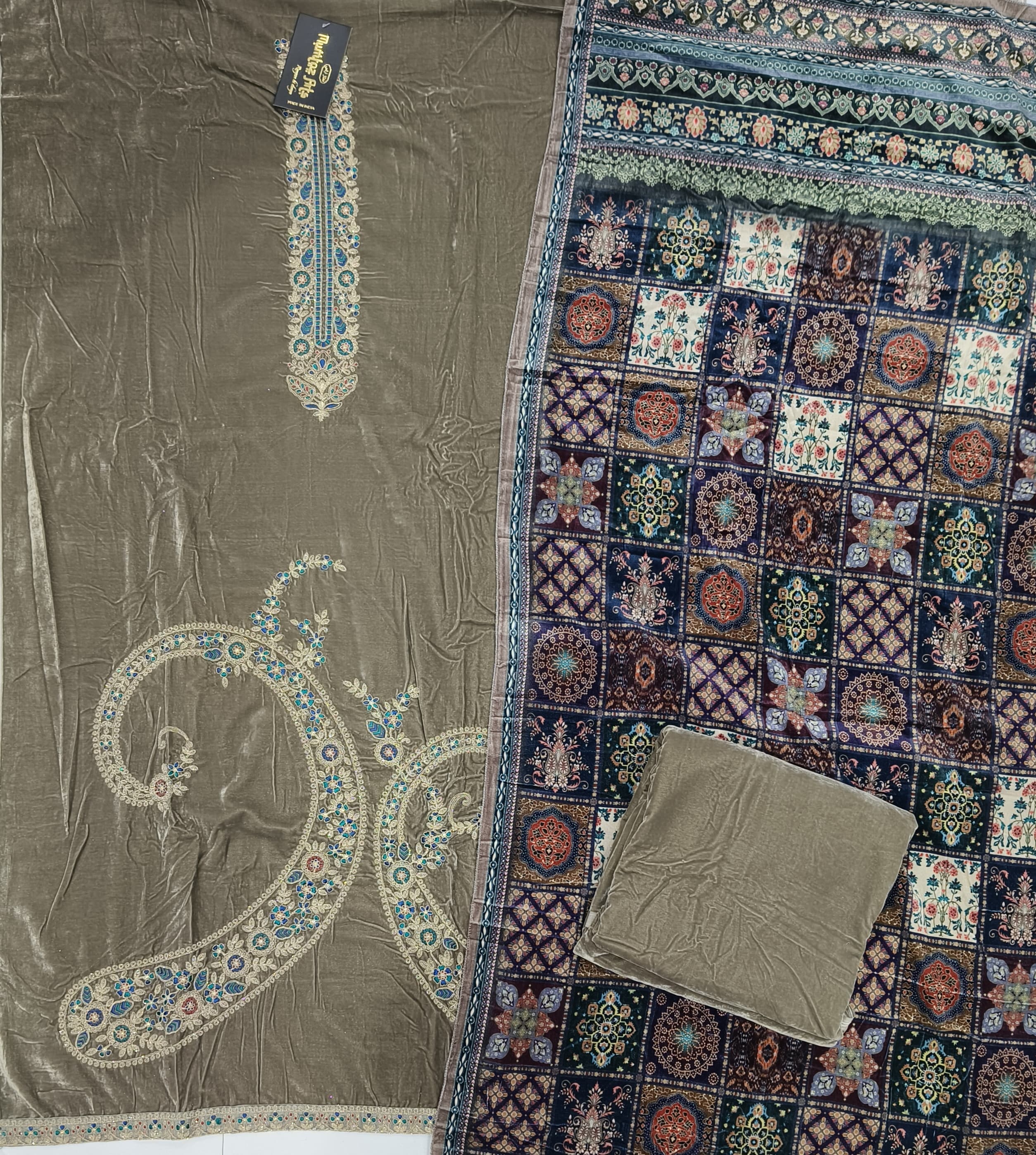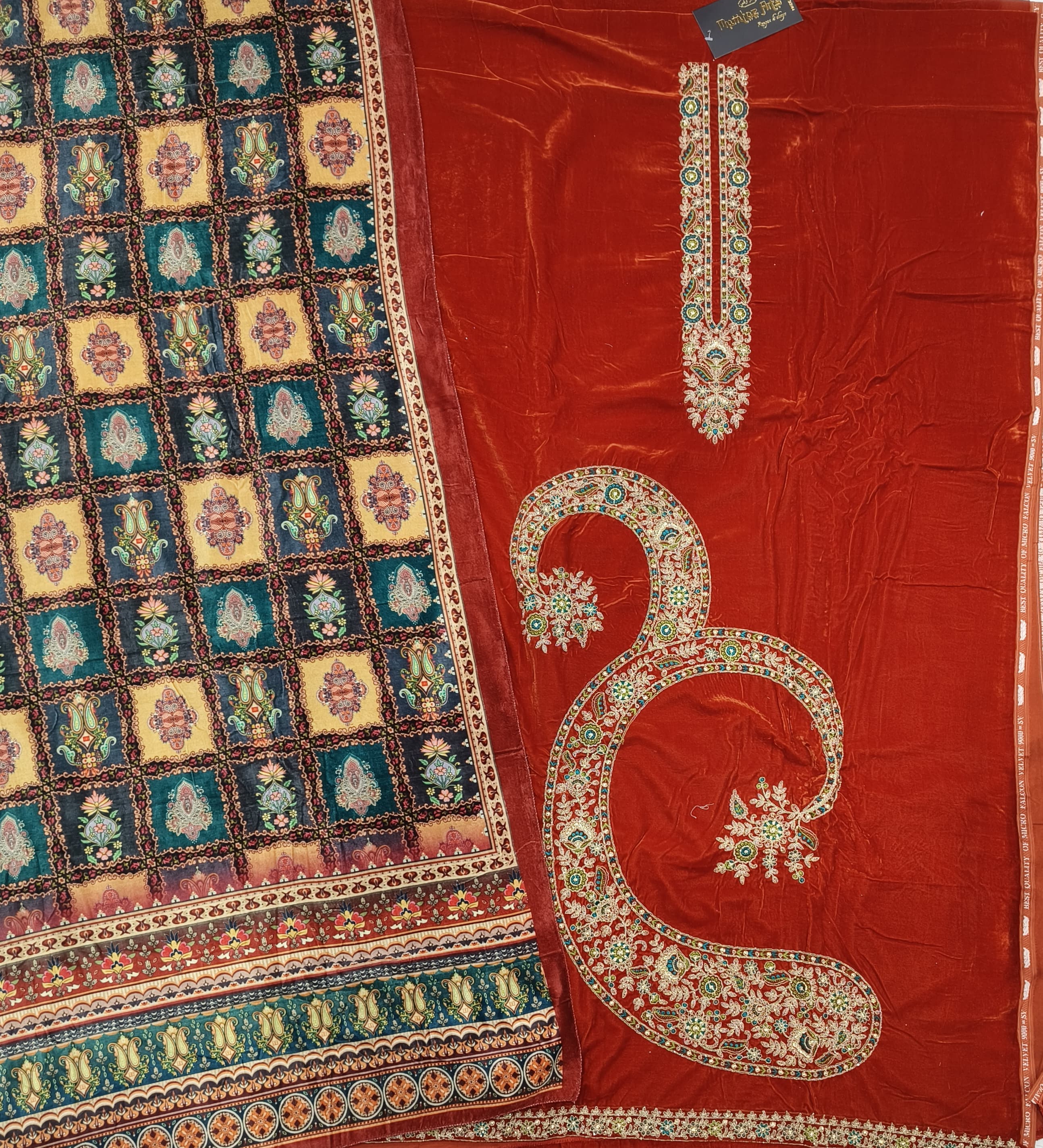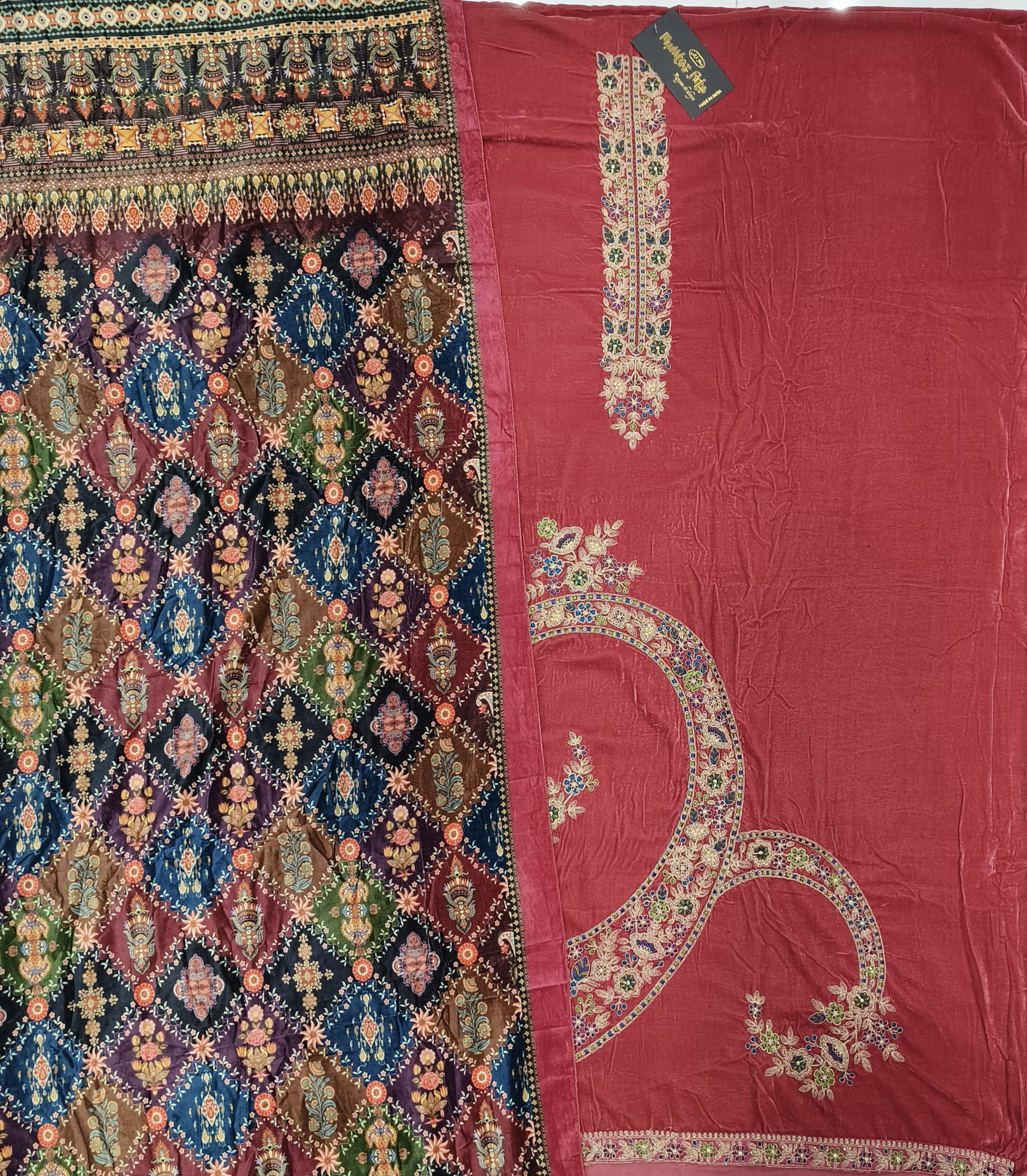 Top: pure velvet dyed with heavy embroidery on neck and heavy embroidery on daman