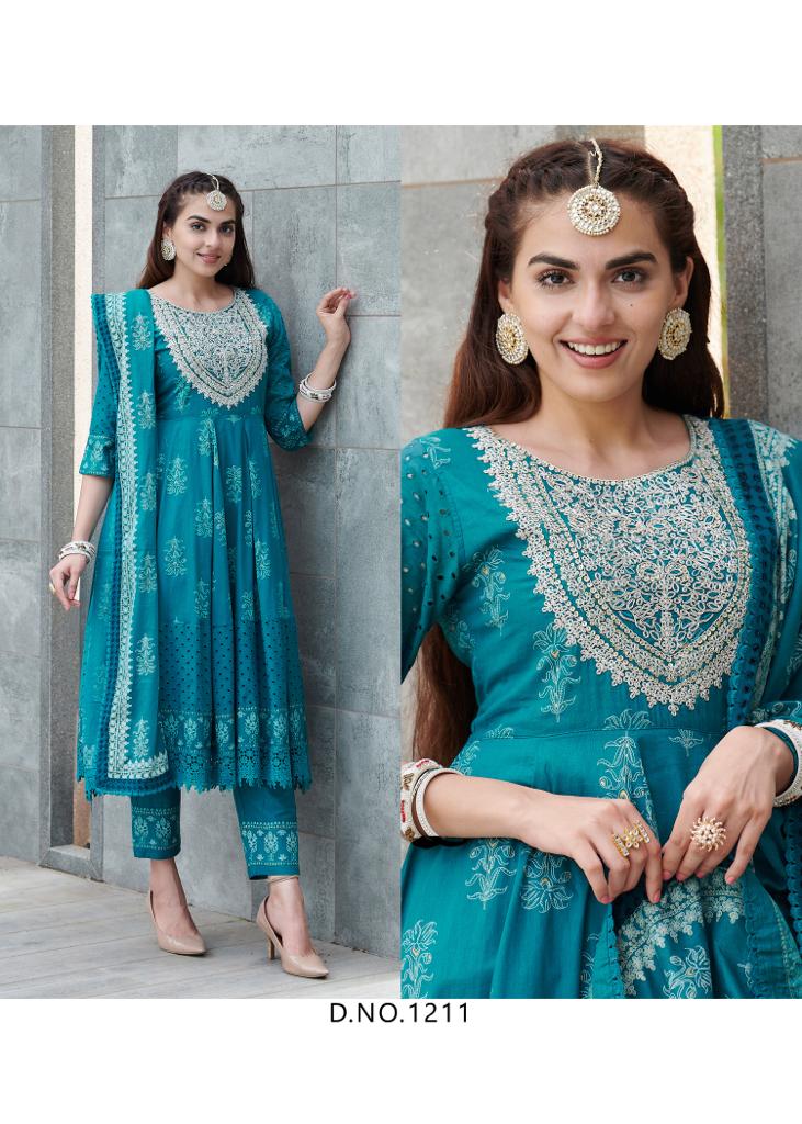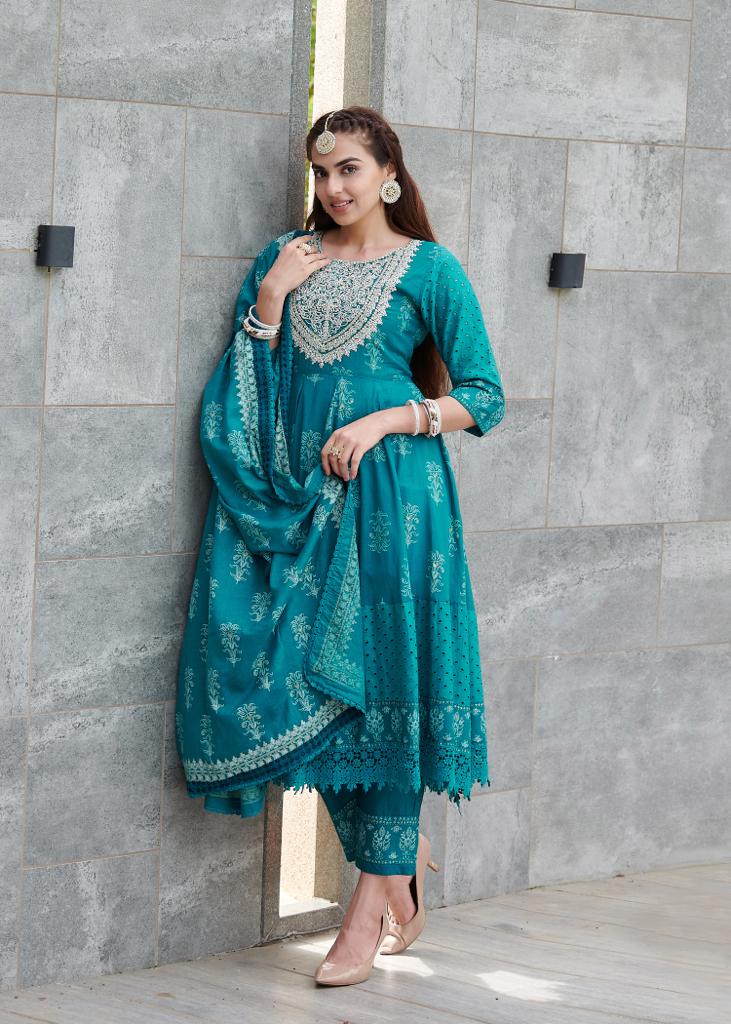 TOP- HEAVY EMBROIDERY NACK WORK WITH PURE COTTON PRINT ANARKALI STYLE WITH SHIFFLI PANEL WORK